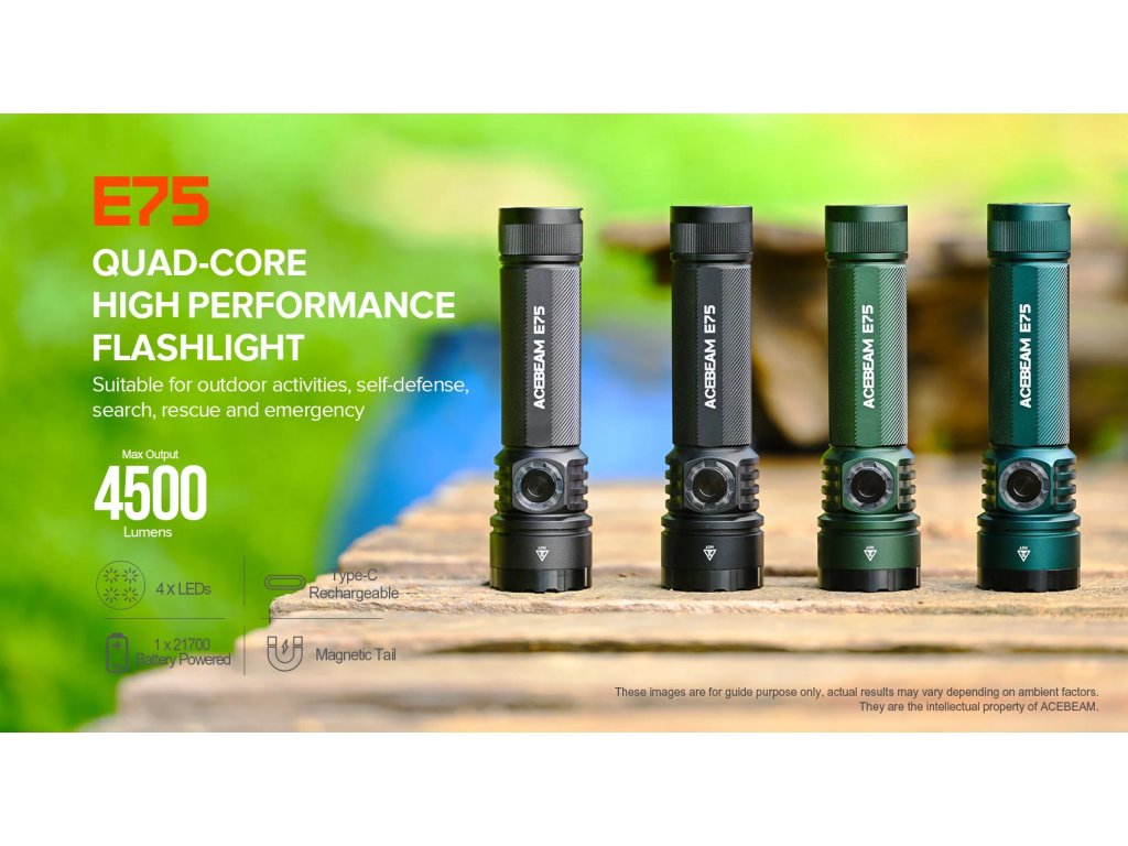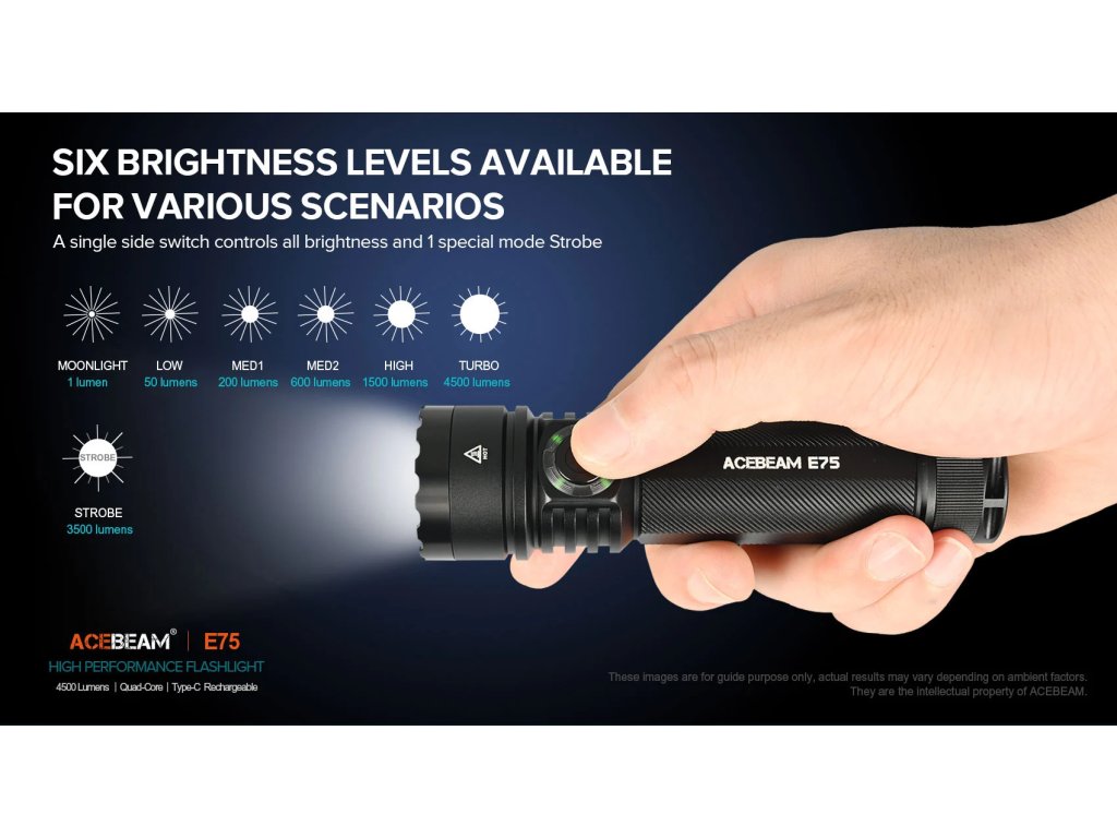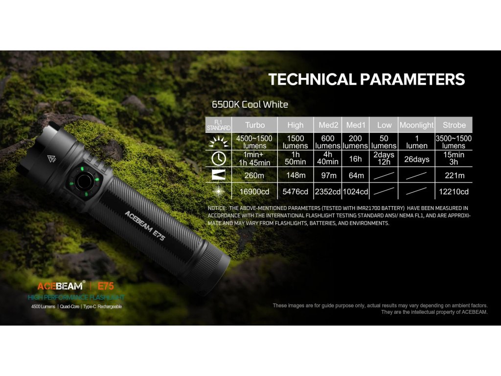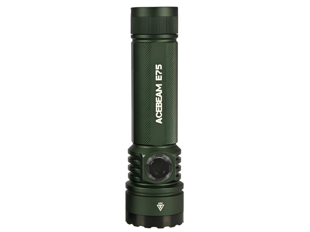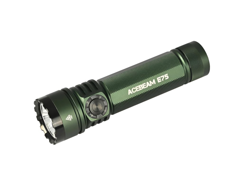 Latarki AceBeam E75 wyróżniają się swoją solidnością, właściwościami taktycznymi i doskonałym wykonaniem. Wersja z czterema chipami LED 6500K Cool White LED osiąga strumień świetlny 4500 lumenów i zasięg doskonałych 260 metrów. Intensywność można przełączać między siedmioma trybami - światło księżyca, niski, średni1, średni2, wysoki i turbo, w którym osiąga wartość 4500 lumenów. Ostatnim trybem jest tryb stroboskopowy. Latarka po wyłączeniu zapamiętuje ostatnio wybraną intensywność i po ponownym włączeniu uruchamia się w tym trybie.