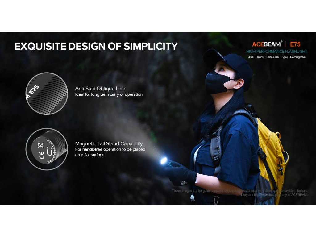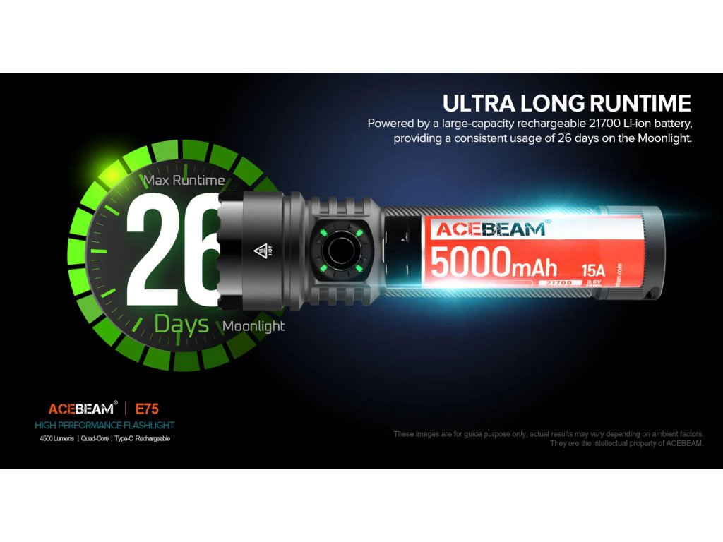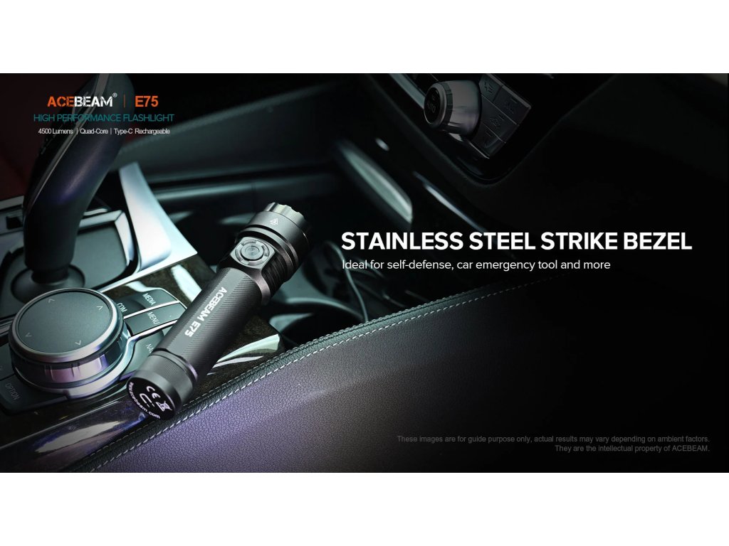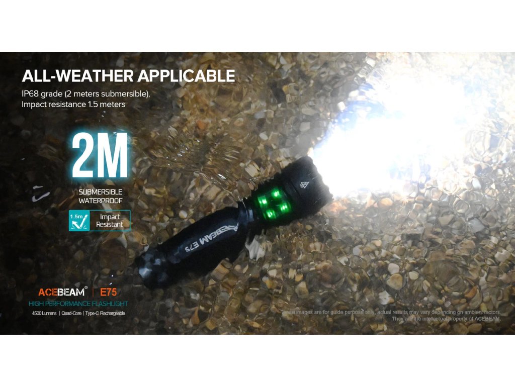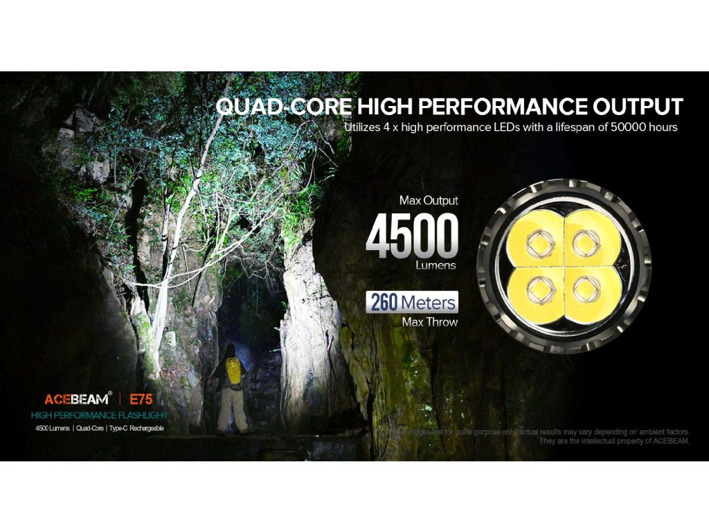 Latarki AceBeam E75 wyróżniają się swoją solidnością, właściwościami taktycznymi i doskonałym wykonaniem. Wersja z czterema chipami LED 6500K Cool White LED osiąga strumień świetlny 4500 lumenów i zasięg doskonałych 260 metrów. Intensywność można przełączać między siedmioma trybami - światło księżyca, niski, średni1, średni2, wysoki i turbo, w którym osiąga wartość 4500 lumenów. Ostatnim trybem jest tryb stroboskopowy. Latarka po wyłączeniu zapamiętuje ostatnio wybraną intensywność i po ponownym włączeniu uruchamia się w tym trybie.