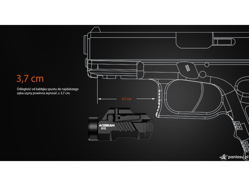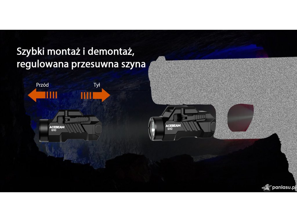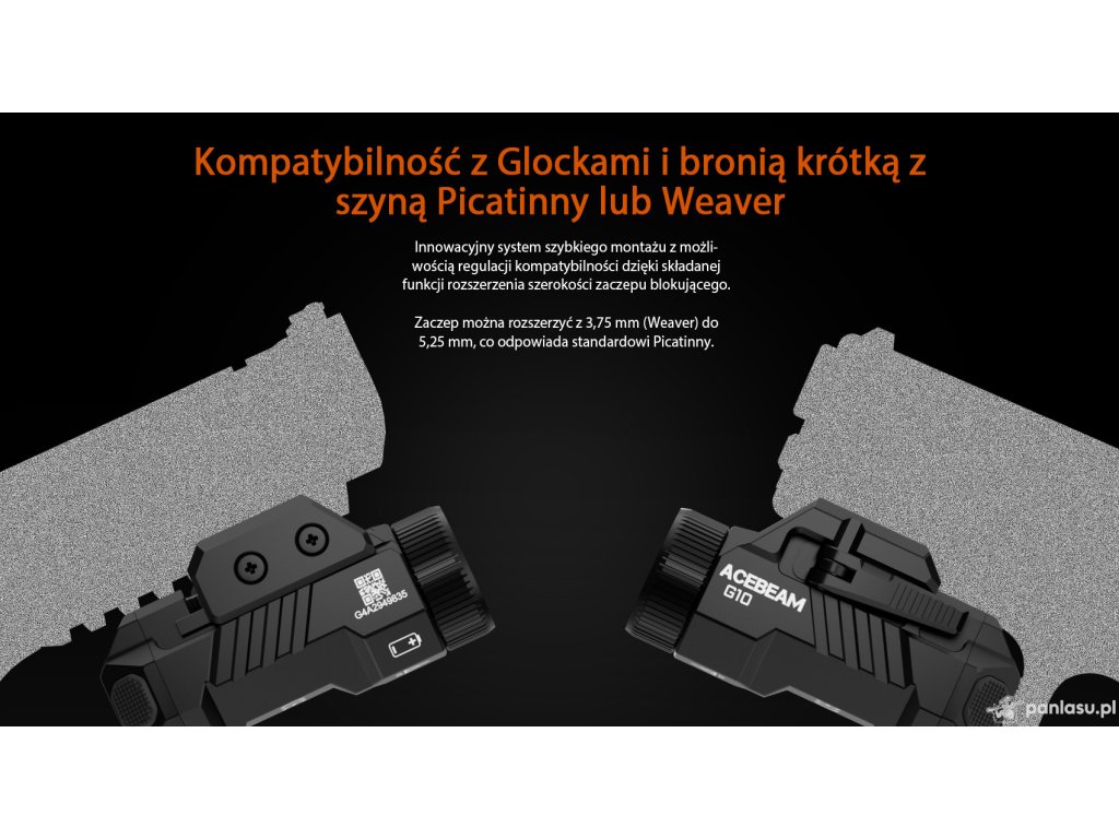 Latarka AceBeam G10 zaprojektowana do montażu na krótkiej broni palnej oferuje unikalny mechanizm szybkozłącza i wysoką wydajność. Zastosowano diodę LED SFT-25R o maksymalnej mocy 600 lumenów i jasności 10 000 nitów, co przekłada się na zasięg do 200 metrów. G10 charakteryzuje się wyjątkowo niską wagą – tylko 87 gramów z akumulatorem! Każdy gram ma znaczenie, zwłaszcza na broni, i to czyni ją wyjątkową. Kolejnym kluczowym aspektem jest kompatybilność – latarka posiada specjalny system mocowania, który dzięki składanej płytce pozwala rozszerzyć ząb blokujący z 3,75 mm (Weaver) na 5,25 mm (Picatinny), zapewniając solidne zamocowanie w obu przypadkach.