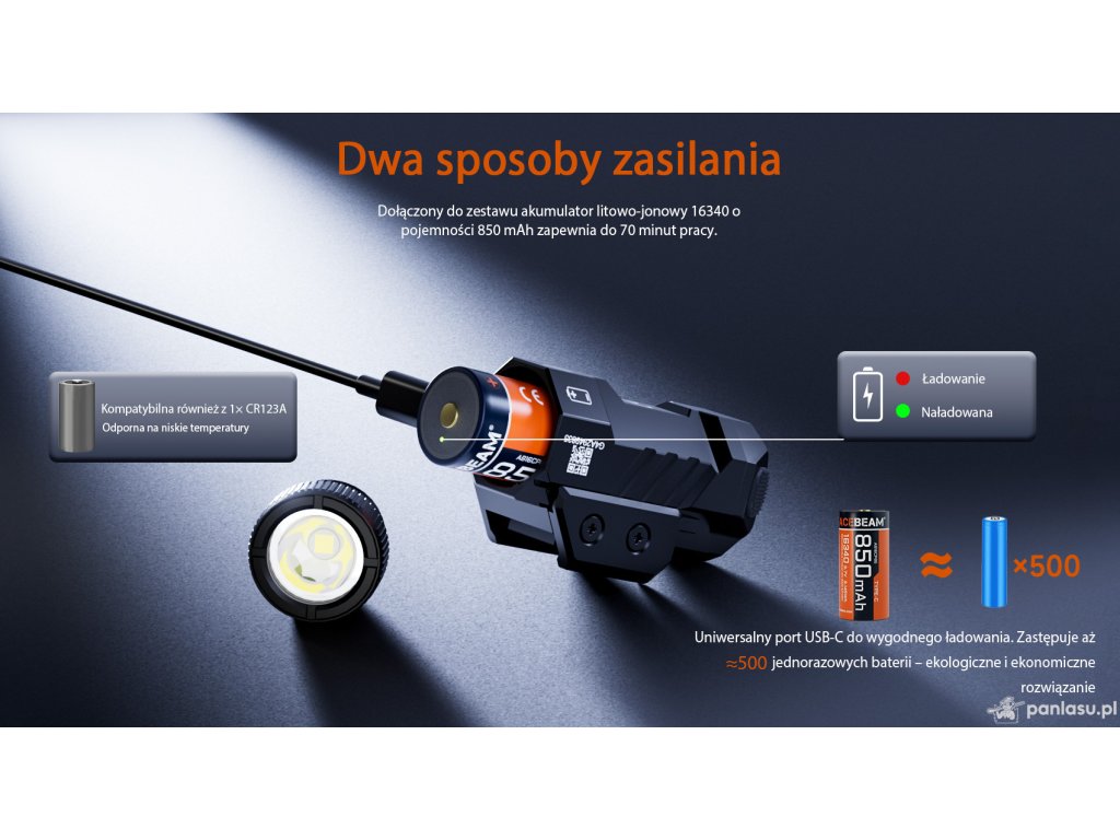 - Dioda 1x LED SFT-25R - Strumień świetlny 600 lm - Temperatura barwowa 6500K (zimna biel) - Jasność 10000 nt - Zasięg 200 m - 1 tryb świecenia (wysoki) - Waga 87 g (z akumulatorem) - Odporność IP68 (zanurzenie do 2 metrów) - Zasilanie 1x akumulator 16340 850 mAh z portem USB-C (alternatywnie CR123A) - Korpus z aluminium z powłoką MAO (plazmowa oksydacja elektrochemiczna) - Wzmocnione ultra czyste szkło z powłoką antyrefleksyjną - Dwa gumowane przełączniki dla użytkowników prawo- i leworęcznych - Unikalny mechanizm mocowania zapewnia maksymalne trzymanie dla szyn Weaver i Picatinny - Ząb blokujący można rozszerzyć z 3,75 mm (Weaver) na 5,25 mm (Picatinny) - Powłoka MAO o jasnoszarym marmurkowym wzorze