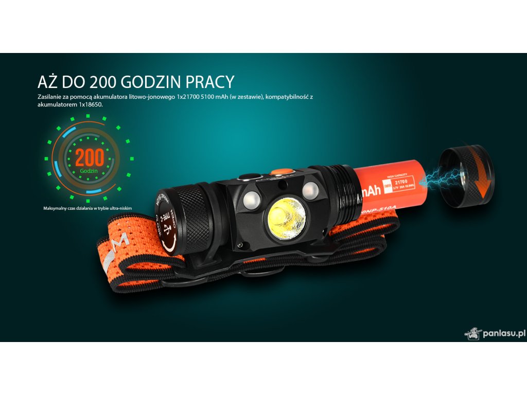 - Dioda CREE XH-P 70.2 – Dodatkowe diody LED: Czerwona i światło CRI90 (CREE XPE2-R2 630 nm i Nichia 219C 5000K) - Chromatyczność 5000K (dzienna biel) - Jasność 7300 nt - Zasięg 171 m - 9 trybów oświetlenia (Ultra-niski, niski, średni, wysoki, turbo, turbo-max, SOS, czerwony, światło CRI90) - Cyfrowo regulowany obwód dla stałej jasności - Waga 80 g (bez baterii) - Odporność IP68 (zanurzenie do dwóch metrów) - Odporność na upadek z wysokości 1 metra - Zasilanie 1x 21700 lub 1x 18650 bateria - Wskaźnik niskiego stanu baterii - Korpus wykonany ze stopu aluminium z powłoką odporną na uszkodzenia mechaniczne - Hartowana ultra przejrzysta soczewka szklana z powłoką antyrefleksyjną - Możliwość postawienia na dolnej krawędzi i użycia latarki jako świecy - Regulowany pasek na głowę z uchwytem na latarkę umożliwiający szeroki zakres nachylenia - Funkcja powerbanku, pozwalająca na ładowanie innych urządzeń za pomocą dwukierunkowego kabla USB-C - Czarny kolor - Pomarańczowy pasek z elementami odblaskowymi