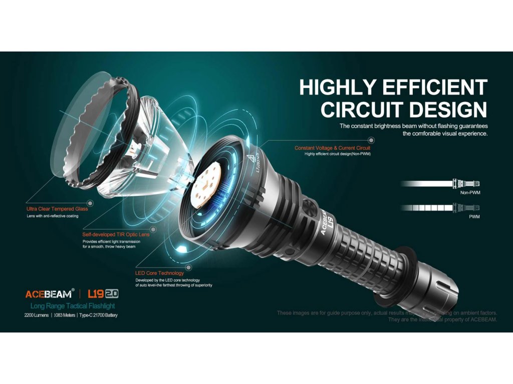 Latarki AceBeam serii L są przeznaczone do użytku taktycznego i myśliwskiego. Model L19 2.0 jest ulepszoną wersją bardzo popularnej latarki, która oferuje doskonałe funkcje i niespotykaną perfekcję w każdym szczególe w swojej klasie. Wersja z diodą LED SFT40 Hi 6500k osiąga wartość strumienia świetlnego 2200 lumenów, a zasięg wynosi niewiarygodne 1083 metry. Intensywność można przełączać między siedmioma trybami - światło księżyca, niski, średni1, średni2, wysoki i turbo, przy którym osiąga wartość 2200 lumenów. Ostatnim jest tryb stroboskopowy. Latarka dodatkowo pamięta ostatnio wybraną intensywność po wyłączeniu i po ponownym włączeniu uruchamia się w tym trybie.
