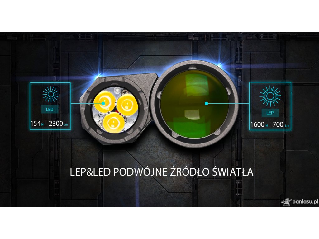 - Dioda LED 3x Nichia 519A oraz 1x laserowy moduł LEP - Strumień świetlny 2300 lm (w trybie LEP 700 lm) - Temperatura barwowa 5000K (biała dzienna) - Oświetlenie LED z wartością CRI90 - Jasność 640000 nt - Zasięg 1600 m (w trybie LED 154 m) - 7 trybów świecenia (Moonlight, Niski, Średni1, Średni2, Wysoki, Turbo i Stroboskop) - Podwójna głowica - Możliwość regulacji ogniskowania światła laserowego - Waga 232,2 g bez akumulatora; z akumulatorem 304,6 g - Odporność IP68 (zanurzenie do głębokości 2 metrów) - Odporność na upadek z wysokości 1 metra - Zasilanie za pomocą 1x 21700 - Ładowanie przez port USB-C - Wskaźnik poziomu naładowania - Korpus wykonany z aluminium z powłoką MAO (plazmowa oksydacja elektrochemiczna) - Hartowane ultra czyste szkło z powłoką antyrefleksyjną - Możliwość ustawienia na podstawie – funkcja świecy - Dwa przyciski sterujące - Wykończenie MAO tworzy jasnoszare marmurkowanie