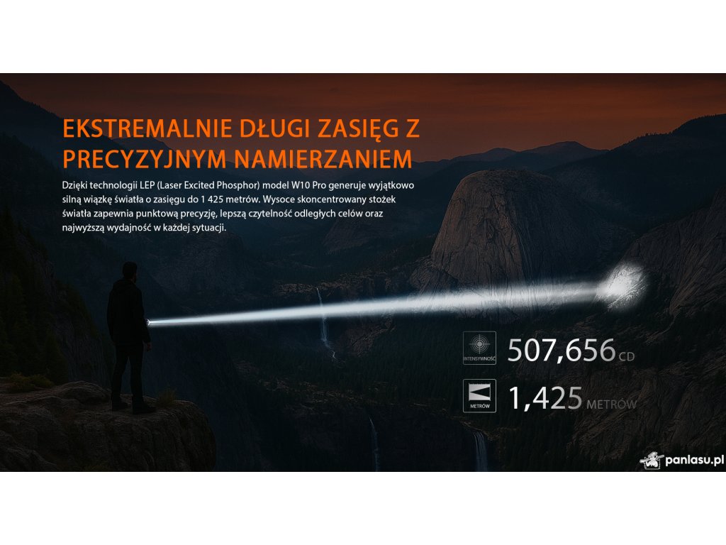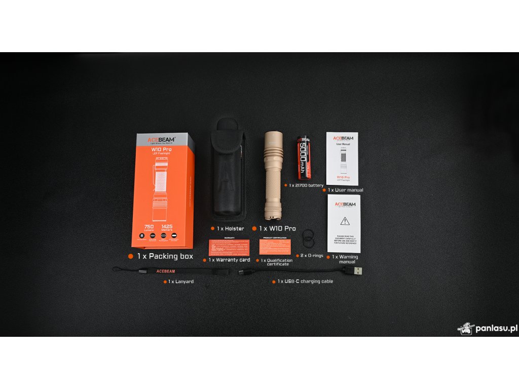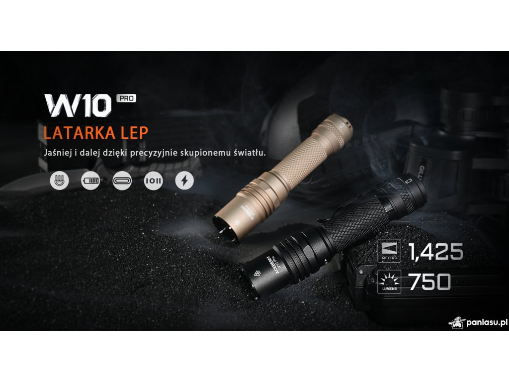 AceBeam W10 Pro to kolejna przełomowa latarka, która przenosi ekstremalną moc latarek LEP do kieszeni spodni. Dosłownie. Latarka o masie 211 g (z akumulatorem), całkowitej długości 152,9 mm i średnicy 34 mm oferuje zasięg trudny do uwierzenia – aż 1 425 metrów. Jasność przekracza pół miliona kandeli, a strumień świetlny przy maksymalnej mocy wynosi 750 lm.W10 Pro oferuje ponadto uderzeniowy pierścień ze stali nierdzewnej, pięć trybów świecenia oraz wbudowane złącze USB-C do ładowania.