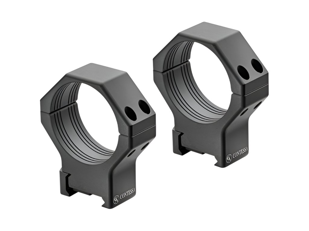 Para pierścieni o średnicy 30 mm z lekkiego, wytrzymałego stopu do szyn Picatinny od renomowanego włoskiego producenta Contessa. Na powierzchni styku znajdują się dwa kliny o szerokości 4,8 mm, które zapewniają absolutne unieruchomienie.