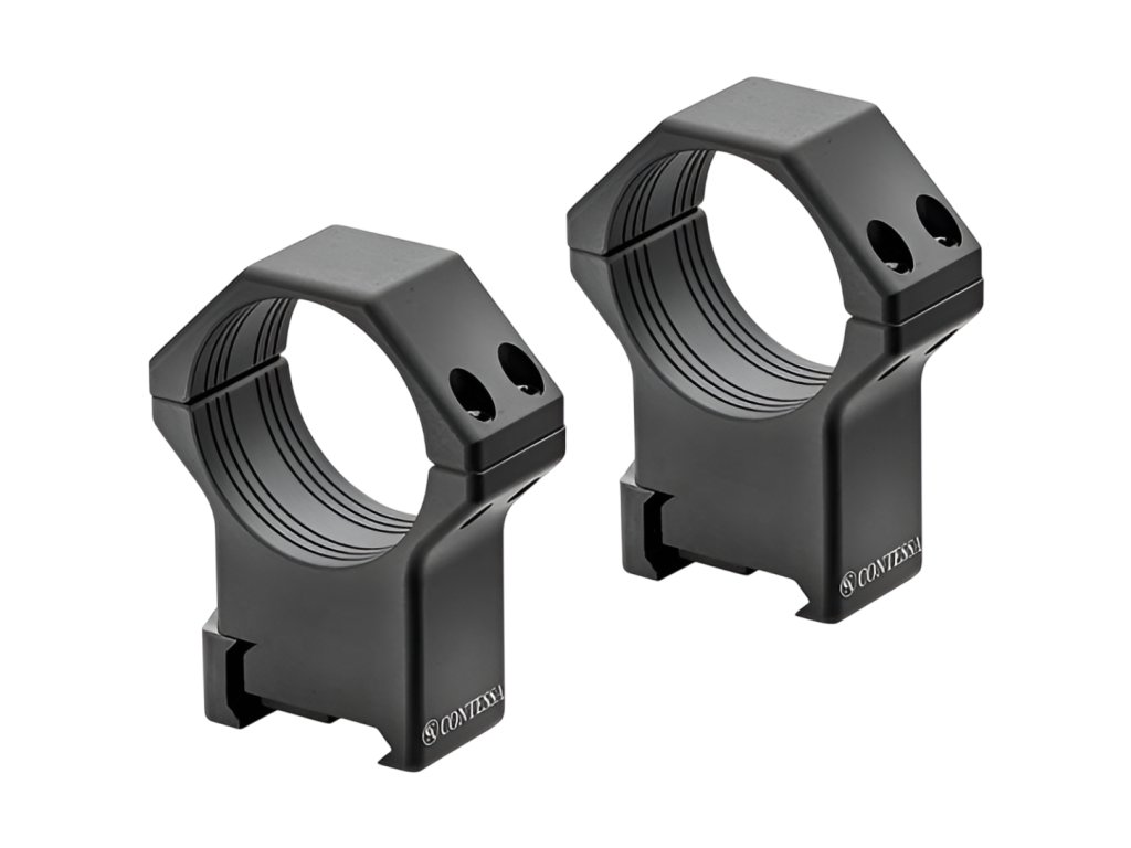 Para pierścieni o średnicy 30 mm z lekkiego, wytrzymałego stopu do szyn Picatinny od renomowanego włoskiego producenta Contessa. Na powierzchni styku znajdują się dwa kliny o szerokości 4,8 mm, które zapewniają absolutne unieruchomienie.