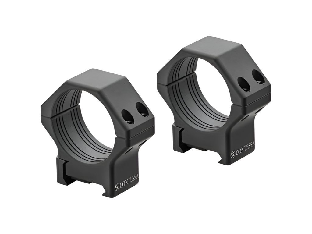 Para pierścieni o średnicy 30 mm z lekkiego, wytrzymałego stopu do szyn Picatinny od renomowanego włoskiego producenta Contessa. Na powierzchni styku znajdują się dwa kliny o szerokości 4,8 mm, które zapewniają absolutne unieruchomienie.